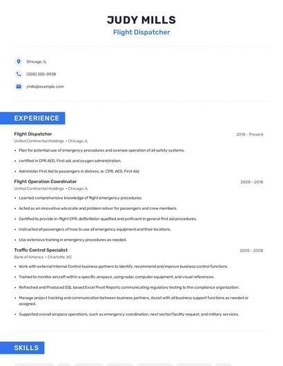 Build a professional flight dispatcher resume in minutes. Browse through our resume examples to identify the best way to word your resume. Then choose from 5+ resume templates to create your flight dispatcher resume.
