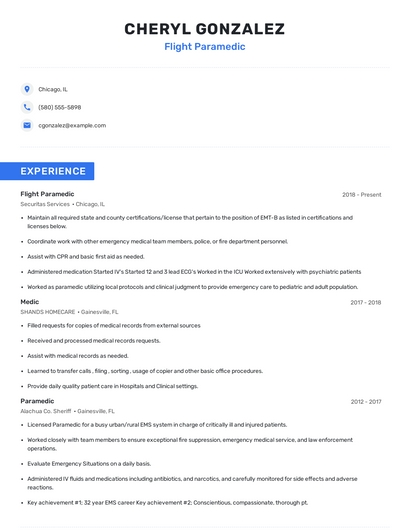 Build a professional flight paramedic resume in minutes. Browse through our resume examples to identify the best way to word your resume. Then choose from 5+ resume templates to create your flight paramedic resume.