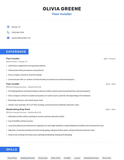 Build a professional floor installer resume in minutes. Browse through our resume examples to identify the best way to word your resume. Then choose from 5+ resume templates to create your floor installer resume.