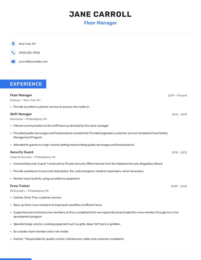 Build a professional floor manager resume in minutes. Browse through our resume examples to identify the best way to word your resume. Then choose from 5+ resume templates to create your floor manager resume.