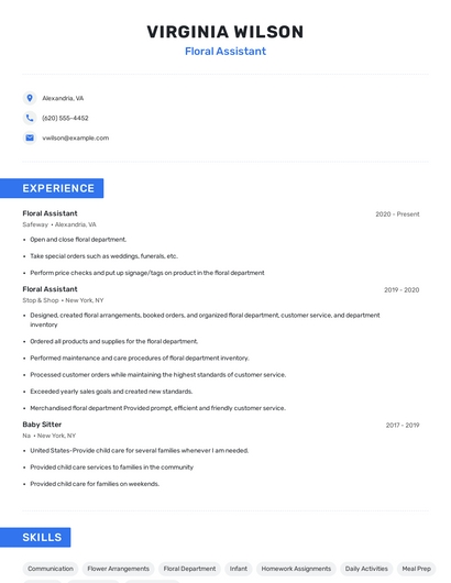 Build a professional floral assistant resume in minutes. Browse through our resume examples to identify the best way to word your resume. Then choose from 5+ resume templates to create your floral assistant resume.