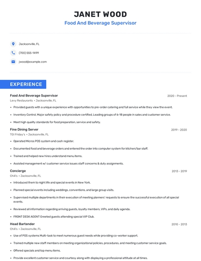 Build a professional food and beverage supervisor resume in minutes. Browse through our resume examples to identify the best way to word your resume. Then choose from 5+ resume templates to create your food and beverage supervisor resume.