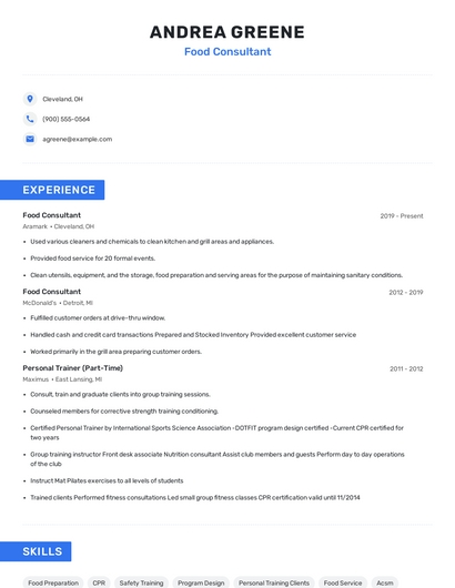 Build a professional food consultant resume in minutes. Browse through our resume examples to identify the best way to word your resume. Then choose from 5+ resume templates to create your food consultant resume.
