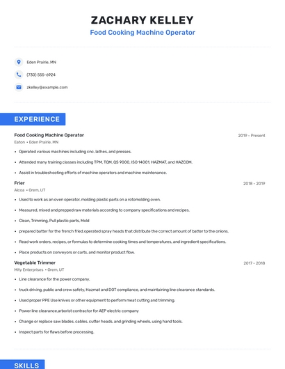Build a professional food cooking machine operator resume in minutes. Our AI resume writing assistant will guide you through every step of the process, and you can choose from 10+ resume templates to create your food cooking machine operator resume.7. Cooking Equipment