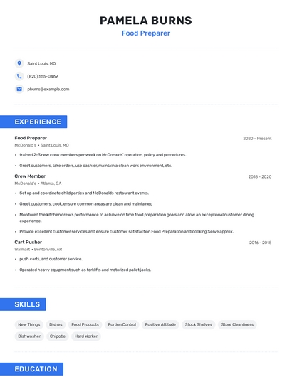 Build a professional food preparer resume in minutes. Browse through our resume examples to identify the best way to word your resume. Then choose from 5+ resume templates to create your food preparer resume.
