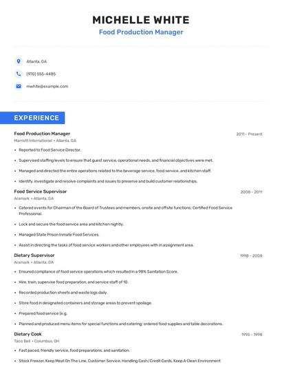 Build a professional food production manager resume in minutes. Browse through our resume examples to identify the best way to word your resume. Then choose from 5+ resume templates to create your food production manager resume.