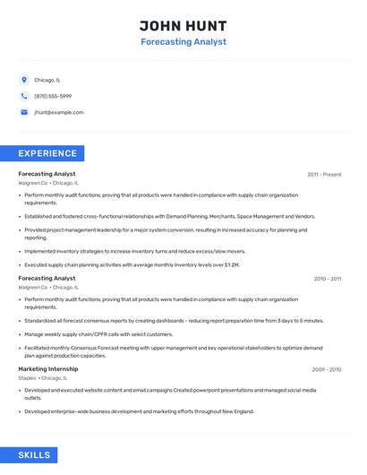 Build a professional forecasting analyst resume in minutes. Browse through our resume examples to identify the best way to word your resume. Then choose from 5+ resume templates to create your forecasting analyst resume.