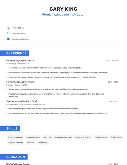 Build a professional foreign language instructor resume in minutes. Browse through our resume examples to identify the best way to word your resume. Then choose from 5+ resume templates to create your foreign language instructor resume.