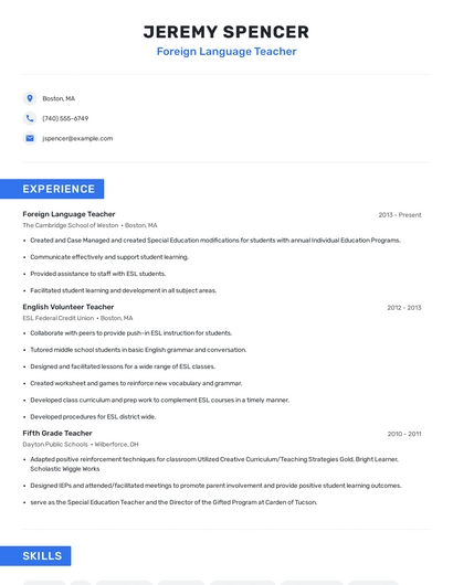 Build a professional foreign language teacher resume in minutes. Browse through our resume examples to identify the best way to word your resume. Then choose from 5+ resume templates to create your foreign language teacher resume.