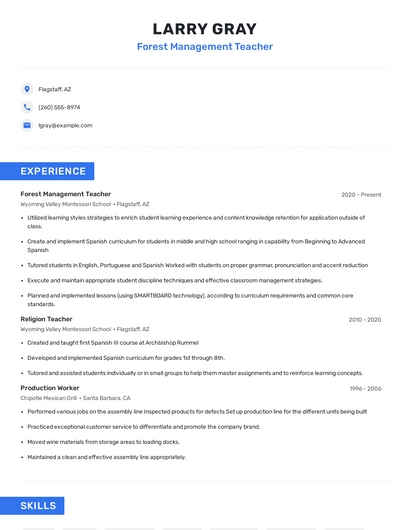 Build a professional forest management teacher resume in minutes. Our AI resume writing assistant will guide you through every step of the process, and you can choose from 10+ resume templates to create your forest management teacher resume.7. Parent-Teacher Conferences