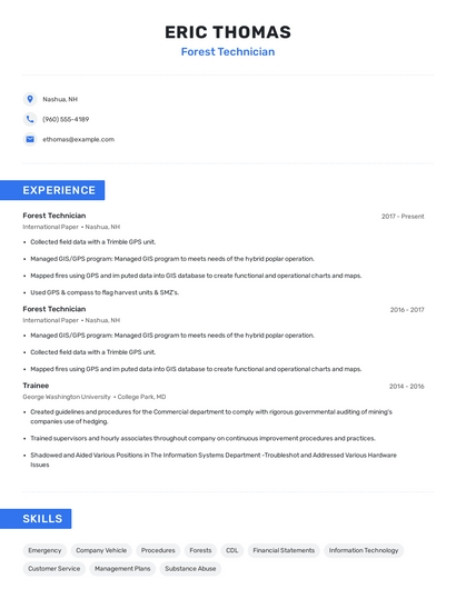 Build a professional forest technician resume in minutes. Browse through our resume examples to identify the best way to word your resume. Then choose from 5+ resume templates to create your forest technician resume.