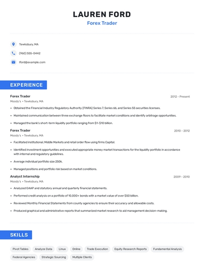 Build a professional forex trader resume in minutes. Our AI resume writing assistant will guide you through every step of the process, and you can choose from 10+ resume templates to create your forex trader resume.7. Foreign Currency