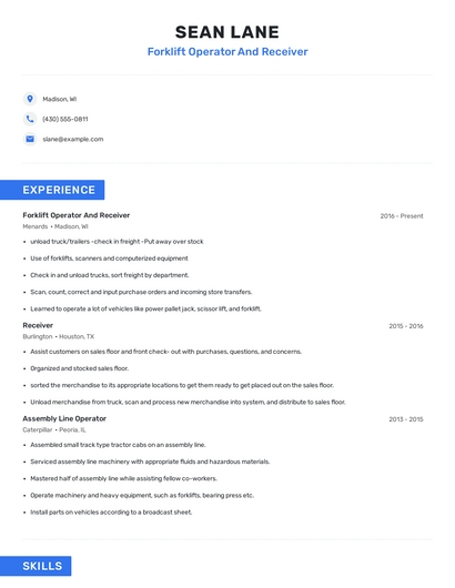 Build a professional forklift operator and receiver resume in minutes. Browse through our resume examples to identify the best way to word your resume. Then choose from 5+ resume templates to create your forklift operator and receiver resume.