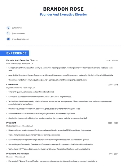 Build a professional founder and executive director resume in minutes. Browse through our resume examples to identify the best way to word your resume. Then choose from 5+ resume templates to create your founder and executive director resume.