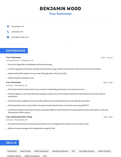 Build a professional frac technician resume in minutes. Browse through our resume examples to identify the best way to word your resume. Then choose from 5+ resume templates to create your frac technician resume.