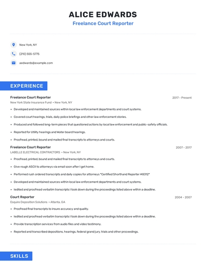 Build a professional freelance court reporter resume in minutes. Browse through our resume examples to identify the best way to word your resume. Then choose from 5+ resume templates to create your freelance court reporter resume.