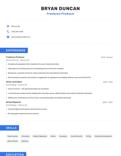 Build a professional freelance producer resume in minutes. Browse through our resume examples to identify the best way to word your resume. Then choose from 5+ resume templates to create your freelance producer resume.
