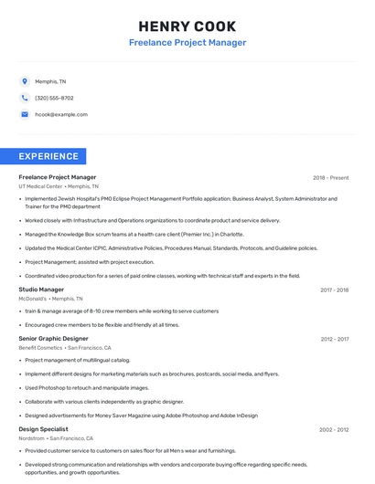 Build a professional freelance project manager resume in minutes. Browse through our resume examples to identify the best way to word your resume. Then choose from 5+ resume templates to create your freelance project manager resume.