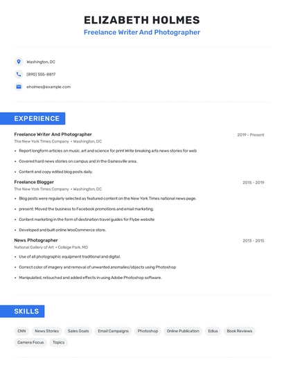 Build a professional freelance writer and photographer resume in minutes. Browse through our resume examples to identify the best way to word your resume. Then choose from 5+ resume templates to create your freelance writer and photographer resume.