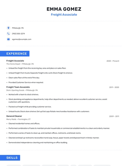 Build a professional freight associate resume in minutes. Browse through our resume examples to identify the best way to word your resume. Then choose from 5+ resume templates to create your freight associate resume.