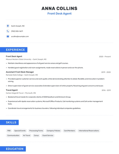 Build a professional front desk agent resume in minutes. Browse through our resume examples to identify the best way to word your resume. Then choose from 5+ resume templates to create your front desk agent resume.