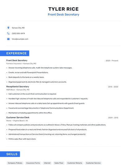 Build a professional front desk secretary resume in minutes. Browse through our resume examples to identify the best way to word your resume. Then choose from 5+ resume templates to create your front desk secretary resume.
