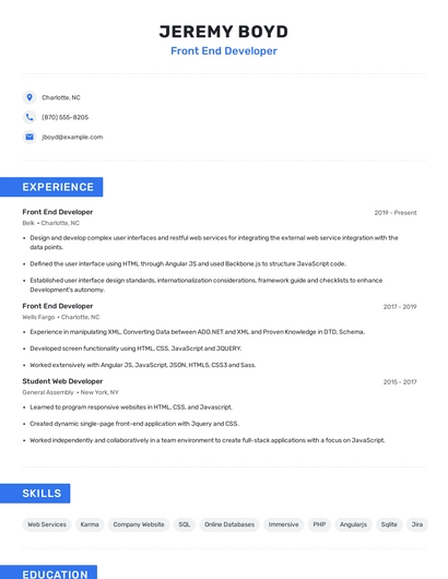Build a professional front end developer resume in minutes. Browse through our resume examples to identify the best way to word your resume. Then choose from 5+ resume templates to create your front end developer resume.