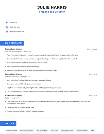 The most important skills for a frozen food selector resume and required skills for a frozen food selector to have include: