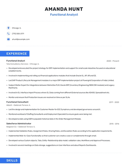Build a professional functional analyst resume in minutes. Browse through our resume examples to identify the best way to word your resume. Then choose from 5+ resume templates to create your functional analyst resume.