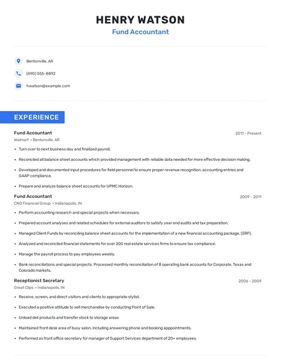 Build a professional fund accountant resume in minutes. Browse through our resume examples to identify the best way to word your resume. Then choose from 5+ resume templates to create your fund accountant resume.