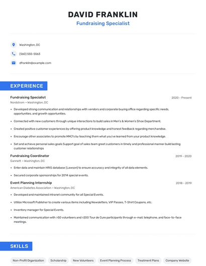 Build a professional fundraising specialist resume in minutes. Browse through our resume examples to identify the best way to word your resume. Then choose from 5+ resume templates to create your fundraising specialist resume.