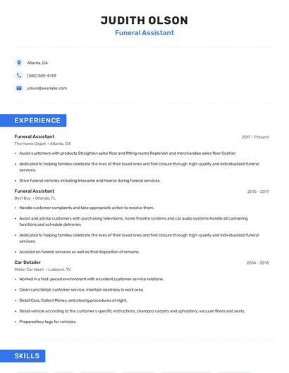 Build a professional funeral assistant resume in minutes. Browse through our resume examples to identify the best way to word your resume. Then choose from 5+ resume templates to create your funeral assistant resume.
