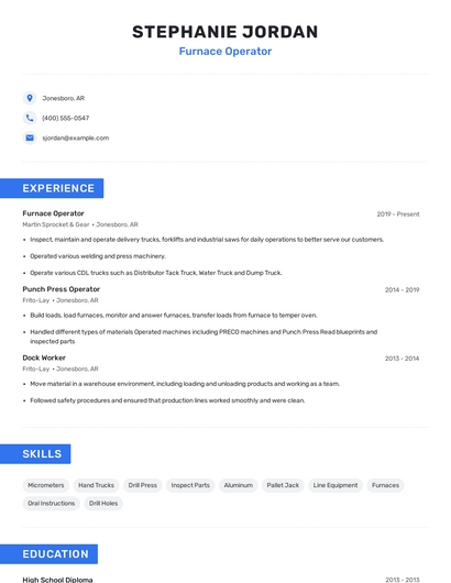 Build a professional furnace operator resume in minutes. Browse through our resume examples to identify the best way to word your resume. Then choose from 5+ resume templates to create your furnace operator resume.