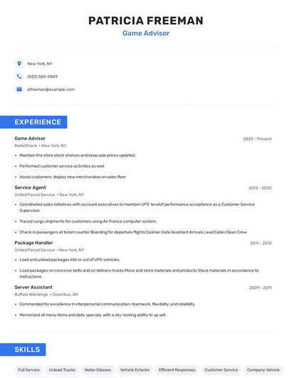 Build a professional game advisor resume in minutes. Browse through our resume examples to identify the best way to word your resume. Then choose from 5+ resume templates to create your game advisor resume.