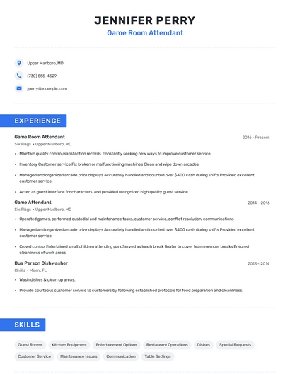 Build a professional game room attendant resume in minutes. Browse through our resume examples to identify the best way to word your resume. Then choose from 5+ resume templates to create your game room attendant resume.