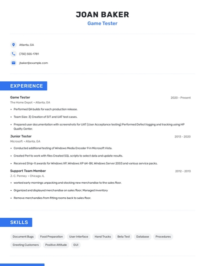 Build a professional game tester resume in minutes. Browse through our resume examples to identify the best way to word your resume. Then choose from 5+ resume templates to create your game tester resume.