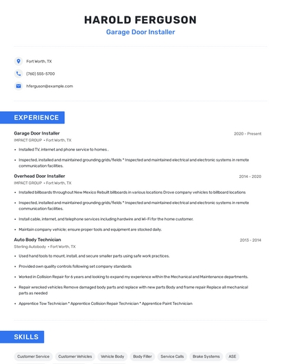 Build a professional garage door installer resume in minutes. Browse through our resume examples to identify the best way to word your resume. Then choose from 5+ resume templates to create your garage door installer resume.