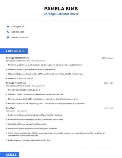 The most important skills for a garbage collector driver resume and required skills for a garbage collector driver to have include: