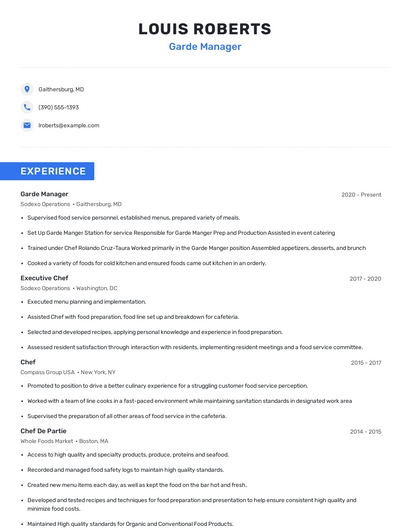 Build a professional garde manager resume in minutes. Browse through our resume examples to identify the best way to word your resume. Then choose from 5+ resume templates to create your garde manager resume.