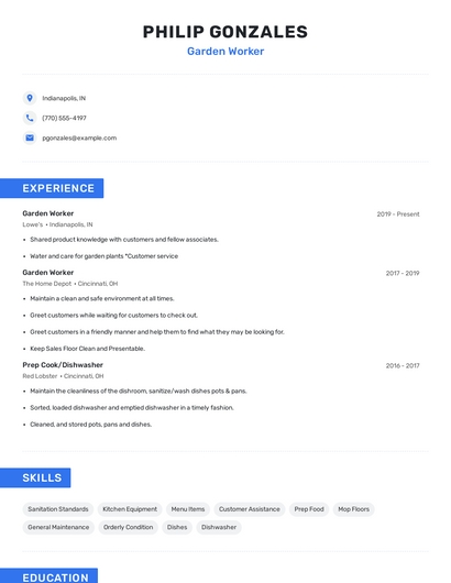 Build a professional garden worker resume in minutes. Our AI resume writing assistant will guide you through every step of the process, and you can choose from 10+ resume templates to create your garden worker resume.7. Shovels