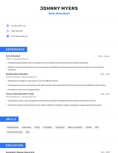 Build a professional gate attendant resume in minutes. Browse through our resume examples to identify the best way to word your resume. Then choose from 5+ resume templates to create your gate attendant resume.