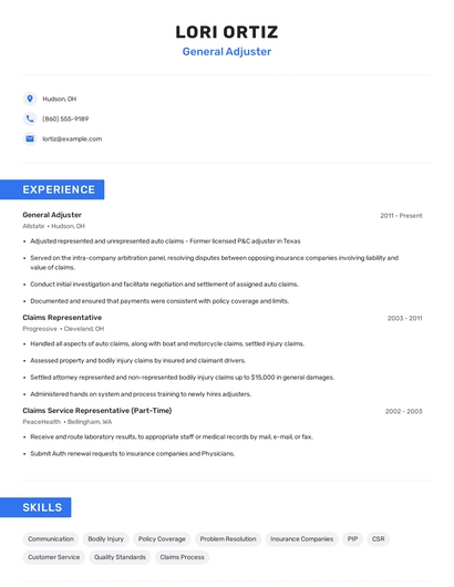 Build a professional general adjuster resume in minutes. Browse through our resume examples to identify the best way to word your resume. Then choose from 5+ resume templates to create your general adjuster resume.