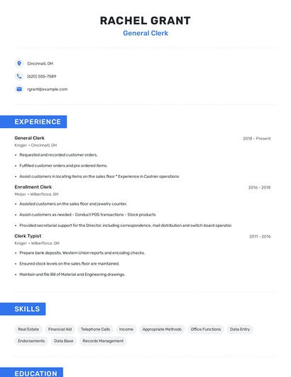 Build a professional general clerk resume in minutes. Browse through our resume examples to identify the best way to word your resume. Then choose from 5+ resume templates to create your general clerk resume.
