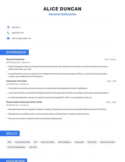 Build a professional general contractor resume in minutes. Browse through our resume examples to identify the best way to word your resume. Then choose from 5+ resume templates to create your general contractor resume.