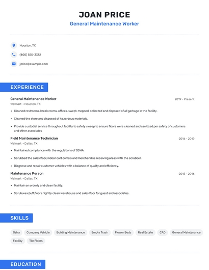 Build a professional general maintenance worker resume in minutes. Browse through our resume examples to identify the best way to word your resume. Then choose from 5+ resume templates to create your general maintenance worker resume.
