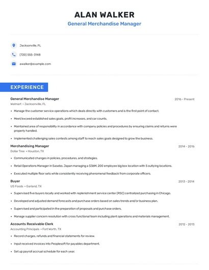 Build a professional general merchandise manager resume in minutes. Browse through our resume examples to identify the best way to word your resume. Then choose from 5+ resume templates to create your general merchandise manager resume.
