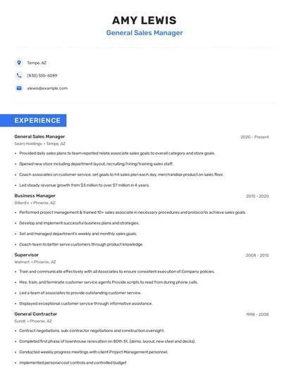 Build a professional general sales manager resume in minutes. Browse through our resume examples to identify the best way to word your resume. Then choose from 5+ resume templates to create your general sales manager resume.