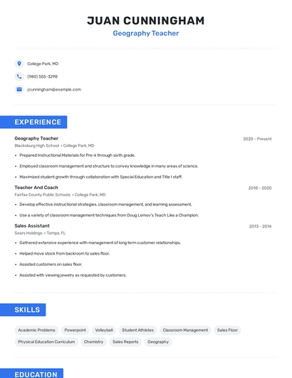 Build a professional geography teacher resume in minutes. Our AI resume writing assistant will guide you through every step of the process, and you can choose from 10+ resume templates to create your geography teacher resume.7. Assessment Tools