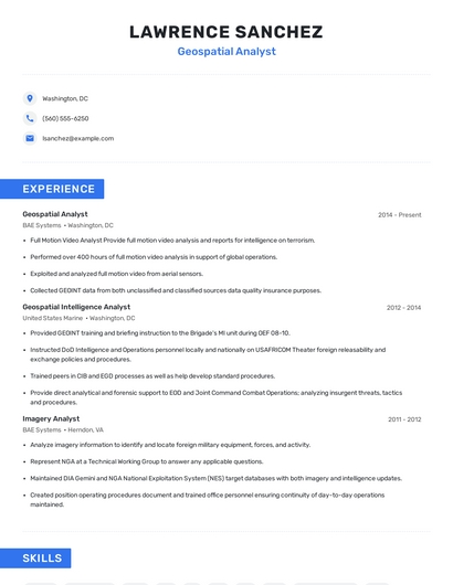 Build a professional geospatial analyst resume in minutes. Browse through our resume examples to identify the best way to word your resume. Then choose from 5+ resume templates to create your geospatial analyst resume.