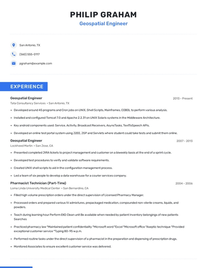 Build a professional geospatial engineer resume in minutes. Browse through our resume examples to identify the best way to word your resume. Then choose from 5+ resume templates to create your geospatial engineer resume.